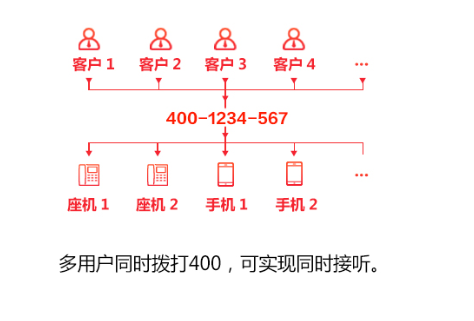 400电话特有一号多线功能,一个400号码可以绑定多部手机、座机,可供多客户同时打入,系统自动选择空闲线路接入,再也不会丢失任何一个商机。