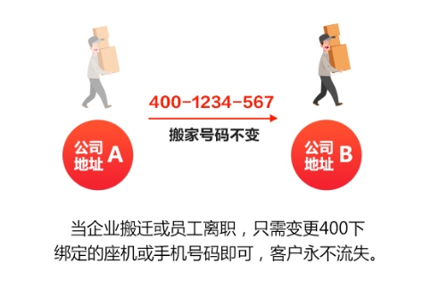 400号码是全国统一的虚拟号码,终生不变。员工离职或企业搬家,只需更换400号码绑定的座机或手机号码即可,老客户照旧拨打,客户一个也不会流失。让企业更安全。